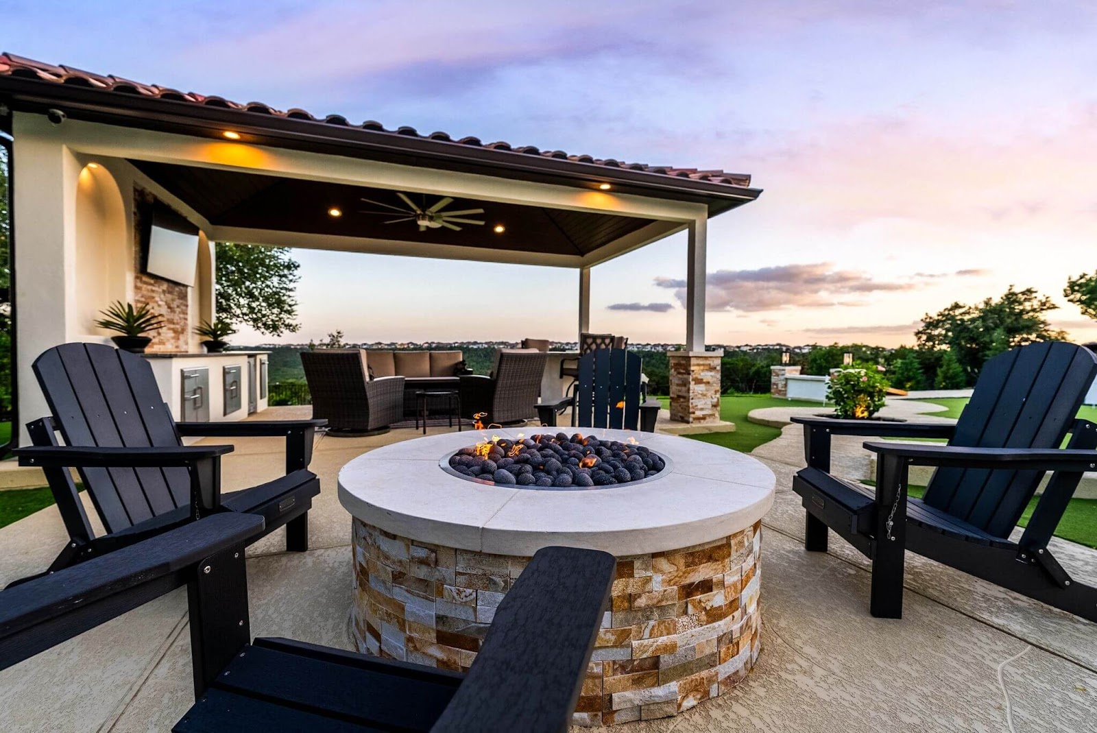 The light-colored stonework keeps the fire pit cool to the touch. It pairs beautifully with the natural stone bases and entertainment wall space under the covered patio in the background.